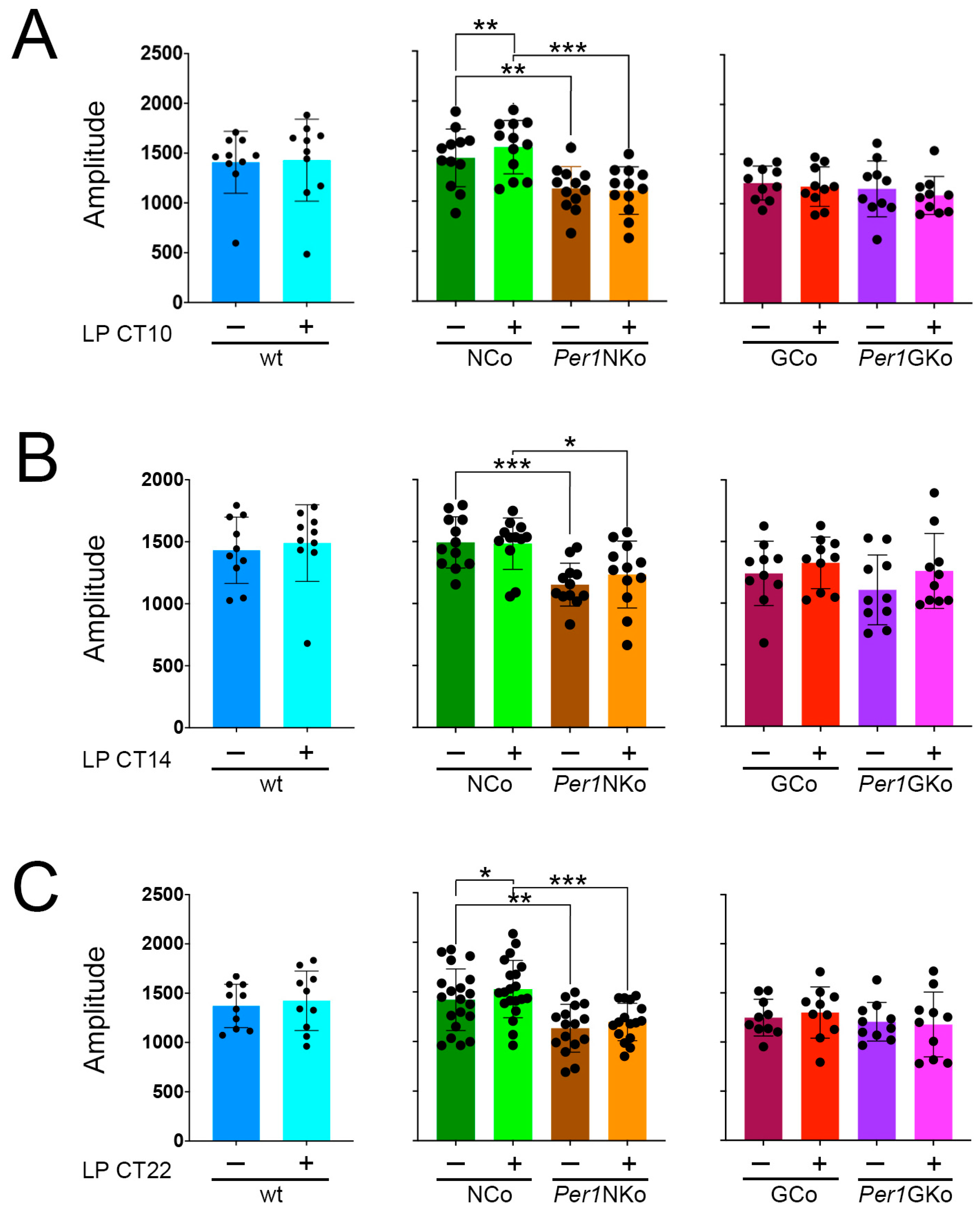 | WT− | WT+ | NCo− | NCo+ | Per1NKO− | Per1NKO+ | GCo− | GCo+ | Per1GKO− | Per1GKO+ |