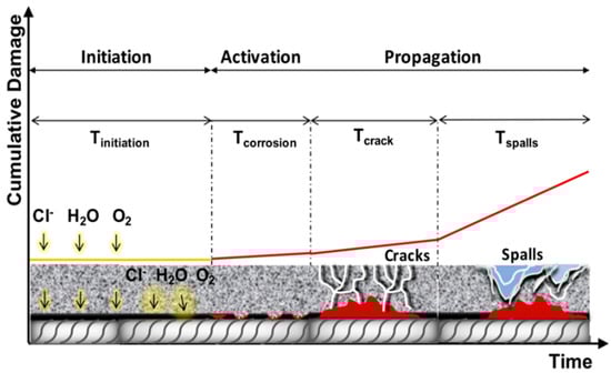 Among various models, Tuutti’s model [20] suggested the corrosion of RC structures as two main stages; initiation of corrosion and propagation of corrosion, shown in Figure 1. The stage for the initiation of corrosion starts with the diffusion of aggressive species through the concrete matrix and finishes when the depassivation and corrosion of the reinforcing steel occurs at localized sites. The initiation stage is controlled by transport processes, carbonation of concrete, and the diffusion rate of chloride ions. This initiation period can be affected by several factors such as concrete quality, concrete cover, and environmental conditions [21].
