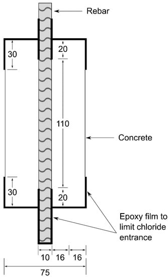 The chloride profile data points were collected over 10 years from the tropical marine environment of Yucatan Peninsula, Mexico, and previously reported in several publications [5,7,30,31]. Among the data points throughout the whole experimental period, the initial 284 data points were used for the development of corrosion initiation model. The rest of data points were considered that they were measured after the corrosion initiation, therefore not applicable to the corrosion initiation model. The samples were prepared by crushed limestone aggregates with Portland cement. Each concrete sample had a cylindrical shape with 75 mm (3 in.) in diameter and 150 mm (6 in.) in height, with a #3 (ASTM) reinforcing bar of 10 mm (0.4 in.) in diameter. Figure 2 shows a schematic description of the sample used for the experiment. The tested samples had different conditions, (1) varied water-to-cement ratios (w/c) of 0.46, 0.5, 0.53, 0.7, and 0.76 and (2) varied days of curing, 1, 3, and 7 days. The samples were exposed at the coastal region, 50 m and 100 m from the ocean. To limit the chloride entrance from top and bottom flats of the samples, the parts were sealed with epoxy coatings. The ranges of the data used for this research are provided in Table 2. More experimental details including the procedure of collecting chloride concentration data for different depths and times are illustrated in previous works [5,7,30,31].