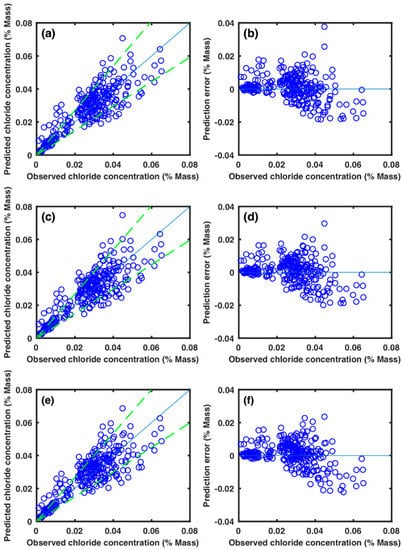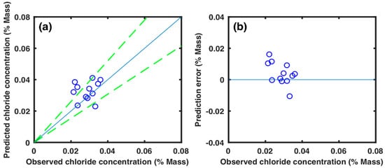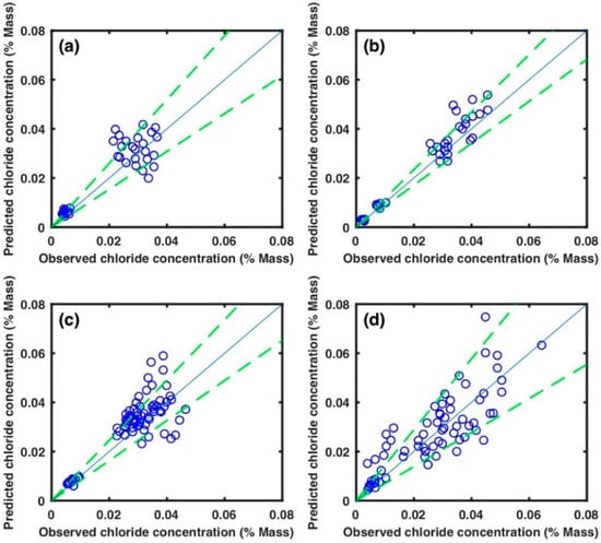 Table 3 presents the results of posterior statistics for the parameters . Figure 3 shows the comparison of chloride concentrations between the model predictions. The blue solid line represents the expected estimation match up of a perfect model, and the green dashed line represents the delimited region within 1 of the standard deviation. From the figure, there is a slight ambiguity of the trend that occurred from the limited number of data samples on this specific reference case. Such ambiguity becomes weaker once the model starts to include the data of other concrete conditions with extra parameters. Note that the small number of the data point in this step is further supplemented by additional data sets later in the text.