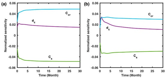 Example normalized sensitivity measures: (a) w/c = 0.5 and = 0.14 and (b) w/c = 0.76 and = 0.14.