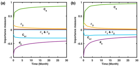 Figure 8 shows the importance measures for the parameters in the reliability model for corrosion initiation. It is noted that the importance measure shows the opposite sign to the sensitivity measures. Thus, it is interpreted that the higher randomness of the positively affecting parameter decreased the reliability and vice versa. The rank of the importance shows the similar trend compared to the sensitivity with the opposite sign. Figure 8 also suggests that , , and are the most important sources of uncertainty throughout the time period. Meanwhile, , , and were estimated to have the smallest effect on the variance of the model as their importance reduced close to zero. This implies that the parameters with the least importance may be considered as constant to further simplify the model.