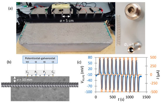 Figure 1. (a) Pictures of the mortar sample with the monitoring device and of the stainless-steel probes. (b) Schematic representation of the sample with the connection to the potentiostat-galvanostat; WE = working electrode, SE = sense electrode, RE = reference electrode, and CE = counter-electrode. (c) Example of typical raw data obtained in this study, showing the evolution of VP1−P2 with time when applying 10 consecutive galvanostatic pulses of 30 s at 500 µA or −500 µA.