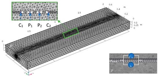 To model the indirect GP measurements, the four electrodes were modeled as perfect point objects on the concrete surface in Wenner configuration, i.e., with the same probe spacing between each electrode and aligned right above and parallel to the rebar. The assumption of point-shaped electrodes is suitable as the geometry of a four-point probe has only a limited effect on calculating the concrete resistivity [66]. The two outer electrodes C1 and C2 act as current electrodes to inject 100 µA and −100 µA, respectively, in order to virtually create their connection to the current generator, while the two inner electrodes P1 and P2 act as potential electrodes; probe spacing a varies between 2.5 and 15 cm. To determine the sensitivity of the technique, the electrodes remain fixed at the center of the element, while the anodic site is moved along the rebar. Thus, the distribution of the current in the material is not affected by changes in border effects, which allows the comparison of all simulations. An extremely fine mesh, with 2.99 million tetrahedral elements ranging from 0.0004 to 0.04 m, was used for evaluating the temporal evolution (without further indication from 0 to 30 s, with time steps of 0.2 s) with MUMPS (multifrontal massively parallel sparse direct solver) and a relative tolerance of 0.001 in order to obtain an accurate solution.