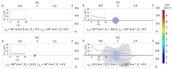 When modeling non-uniform corrosion, an important parameter is the free macrocell current that flows spontaneously between anodic and cathodic sites without external polarization [18]. It depends upon the parameter of the Butler–Volmer equation, mainly the exchange current density and the corrosion potential difference between anode and cathode (Figure 3). The objective of our study was to assess the influence of the monitoring technique on an established corrosion cell. However, in the modeling, the distribution of the macrocell current lines in the domain is not initially established. Hence, the simulation results considered both the effect of the impressed current for corrosion monitoring and the establishment of a free macrocell current. Irrespective of the exchange current density of the anode, the free macrocell current lines are removed when Eeq,a = Eeq,c = 0 V. For the other conditions, the current varies with time but gradually tends towards a constant value, indicating that a steady state is reached (surface potential). Hence, to eliminate the influence of these spontaneous current lines on corrosion monitoring, both anodic and cathodic potentials were fixed at 0 V in this study. Even though this value is not representative of a real macrocell process and can affect any quantitative determination, it does not affect the qualitative insights obtained by our study. To use representative values for anodic and cathodic potentials, it would have been possible to use the steady-state obtained without external polarization as initial conditions to the simulations with external polarization to remove the effect of the free macrocell current of the potential difference.