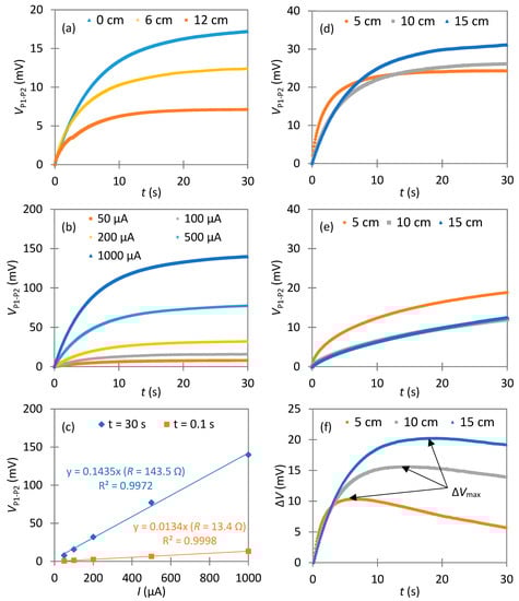 Figure 4. Experimental results obtained on the mortar sample using the indirect galvanostatic pulse (GP) technique. (a) Influence of the distance of the probe from the rebar on the evolution of VP1−P2 with I = 100 µA and a = 15 cm, all electrodes being parallel to the rebar, (b) influence of the injected current (50–1000 µA) on the evolution of VP1−P2 with a = 15 cm, (c) evolution of VP1−P2 as a function of the impressed current for a = 15 cm at t = 0.1 s and 30 s, (d) influence of the probe spacing on VP1−P2 with I = 200 µA for the passive rebar (reproduced from Reference [2]), (e) influence of the probe spacing on VP1−P2 with I = 200 µA after the introduction of chlorides from the concrete surface through wetting/drying cycles, and (f) evolution of ΔV with time for each probe spacing, showing the difference between the passive rebar and the rebar after Cl introduction.