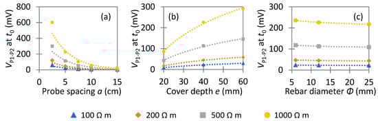 We first focused on the instantaneous potential difference obtained at t0. All the values reported in Table S1 were obtained considering both active and passive corrosion. Hence, the instantaneous ohmic drop appears independent of the electrochemical state of the steel/concrete interface (i.e., Butler–Volmer input parameters). For each resistivity, VP1−P2 decreases nonlinearly when increasing the probe spacing a (Figure 5a), decreasing the cover depth e (Figure 5b), or increasing the rebar diameter Φ (Figure 5c).
