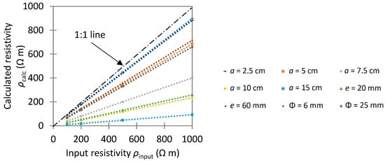 Figure 6. Comparing input concrete resistivity with the concrete resistivity calculated with Equation (6), considering the accurate geometric factor kCOMSOL for each simulation. The calculated resistivity decreases when increasing a, decreasing e or increasing Φ as more current reaches the rebar.