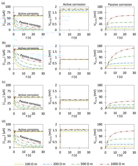 Figure 7. Example of results showing the temporal evolution of Irebar and VP1−P2 obtained when considering uniform corrosion in both active (i0,a = 0.1 A m−2) or passive states (i0,c = 10−5 A m−2). (a) a = 5 cm, e = 40 mm and Φ = 12 mm; (b) a = 15 cm, e = 40 mm and Φ = 12 mm; (c) a = 5 cm, e = 60 mm and Φ = 12 mm; (d) a = 5 cm, e = 40 mm and Φ = 25 mm. The complete results from this parametric study are presented in Figure S2.