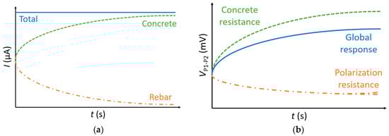 Figure 8. Schematic representation of the physical aspect of the indirect GP technique in Wenner configuration. (a) Evolution of the distribution of the current in the concrete and in the rebar; (b) evolution of the potential difference attributed to concrete resistance, polarization resistance, and the global response.