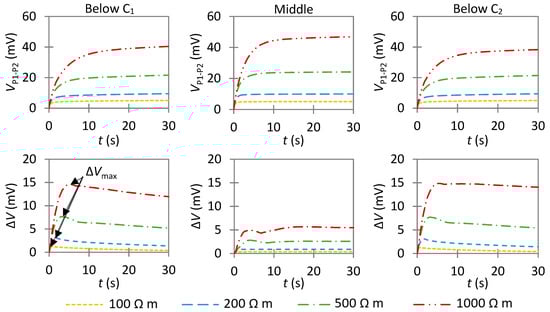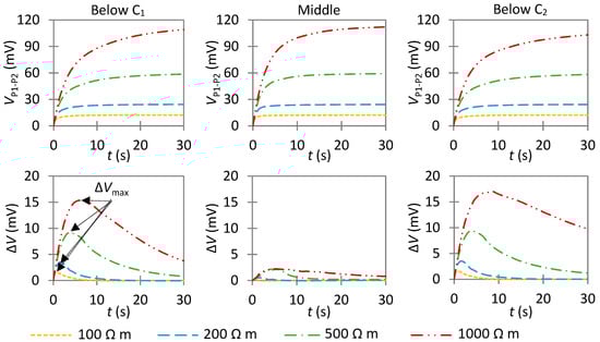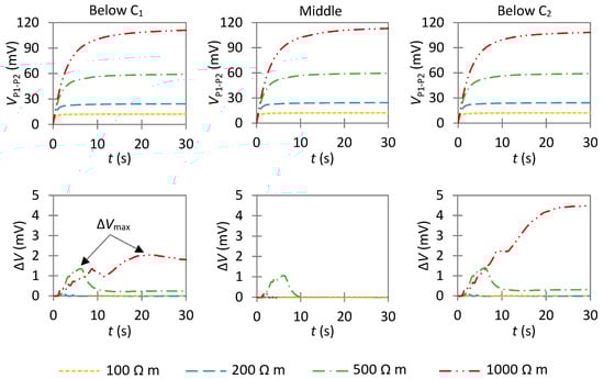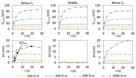 Figure 9. Evolution of VP1−P2 and ΔV over time in the presence of a slightly corroding area at different positions relative to the monitoring device. Input parameters: i0,a = 10−4 A m−2, i0,c = 10−5 A m−2, La = 1 cm, a = 5 cm, e = 40 mm, Cdl,a = Cdl,c = 0.2 F m−2, IC1 = 100 µA.