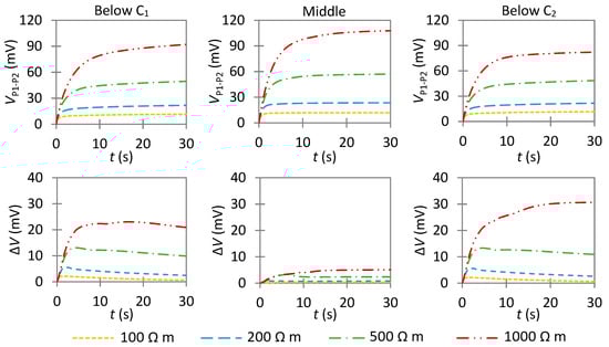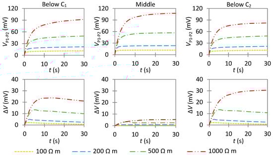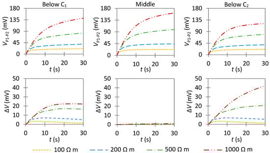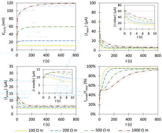 A “quasi-steady-state” is reached after only 30 s for ρ = 100 Ω m. Indeed, as the polarizing current is already very low at this time, variations in VP1−P2 are almost insignificant. This is considerably shorter than the time required to reach the steady state in the conventional three-electrode configuration for passive rebar, as already noted in References [22,28,35]. However, the higher the concrete resistivity, the slower the current that polarizes the rebar decreases and the longer it takes to reach the quasi-steady-state potential. Hence, for highly resistive concrete, a longer polarization time is required to reach the steady state, though a quasi-steady-state is reached in about 300 s (Figure S3).