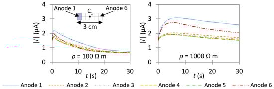 For passive corrosion, the current polarizing the rebar decreases nonlinearly over time before reaching very low values at the end of the simulations (Figure 7 left and Figure S2). After 30 s, the total current on the rebar is less than 1 µA for ρ = 100 Ω m, irrespective of probe spacing, but it remains higher than 5 µA for ρ = 1000 Ω m. As concrete resistivity decreases, the current decreases more rapidly. This is related to the high polarization resistance of the rebar and the different behavior of a capacitor at high and low frequencies [26]. Theoretically, a capacitor acts as a short-circuit at high frequencies (i.e., over very short times), whereas it acts as an open circuit at low frequencies (i.e., over a long period of time) [35]. Between these two opposite behaviors, the current polarizing the capacitor decreases at a velocity that is dependent on the time constant of the system (τ = RC). This means that at the start of injection, the current can easily flow through the rebar capacitance. In the conventional three-electrode GP technique, as the rebar is the only current sink in the system, the entire impressed current polarizes it each time, either in its capacitive or its resistance component, and the current flows progressively through the polarization resistance when increasing the duration of the injection. However, in the indirect GP technique, the current can simply flow between C1 and C2 through the concrete without polarizing the rebar. In passive condition, due to the high polarization resistance, the concrete progressively becomes the less resistive path in the system as the duration of the injection increases, especially for low resistive concrete. This behavior explains the very low current in the rebar after 30 s when ρ = 100 Ω m. As the total injected current remains constant in the system, the fraction of the current that flows in the concrete without polarizing the rebar increases over time.