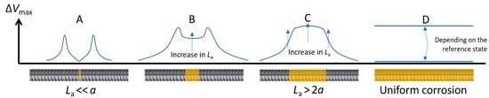 We also used a corrosion potential value of 0 V for modeling uniform corrosion as the results are used as reference states for determining the difference between microcell and macrocell corrosion. The input parameters of the Butler–Volmer equation used in this study are summarized in Table 2. The α values were selected in order to obtain B values (Stern–Geary constant, see Equation (1)) close to 26 mV for active corrosion and close to 52 mV for passive corrosion, which are the common recommended values [60]. In each section, we input one Tafel slope for the anodic reaction and one Tafel slope for the cathodic one, as both microcell and macrocell components are non-negligible values in the total current density [61,62,63].