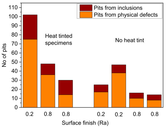 9]. Here, tests were carried out with and without heat-tinting. Prior to testing, the location of inclusions and physical defects on the surface was mapped at high resolution using a scanning electron microscope, and, post-test, the number of pits and their location with respect to inclusions and pre-existing defects were assessed. Notably, there was not a simple correlation with Ra value, which perhaps reflects the frequency of dressing of the grinding wheel. The key observation is that for most cases there was a greater number of pits associated with physical defects compared to inclusions. This raises the question as to the perceived role of inclusions as the commonly assumed primary source of pitting in stainless steels. Is this observation simply a product of the fine surface finish in most laboratory tests, with specimens usually hand-ground or more finely polished? As such, is the adoption of an ideal surface finish in laboratory testing producing results that are specific only to that testing and perhaps misleading when extended to real components in service? More testing with a surface finish representative of that adopted in service is recommended. This does not preclude the role of chemical inhomogeneities acting as pit precursors but ensures that their significance is appropriately weighted.