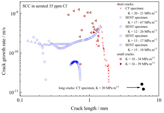 28]. In that application, the combination of a change in potential drop with crack size and critically an acidification of the short crack provided an explanation. For this steam turbine application, the distinguishing feature is the low solution conductivity. It would be anticipated conceptually that significant changes in crack-tip potential between short and long cracks would arise, simply for that reason. Predictions of electrochemical modelling [