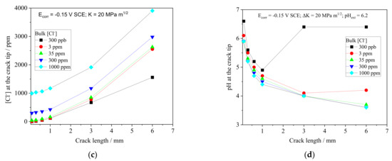 Figure 9) with the crack-tip potential decreasing with crack length, most significantly for the lowest solution conductivity. However, it is notable that the concentration of both chloride ions and hydrogen ions at the crack-tip increases with increasing crack length, suggesting that the chemistry would be more aggressive for the longer crack. In the model, the current density on the crack walls is assumed to be associated with the passive current. However, as noted previously in the text, pitting of this FV566 12Cr steel occurs between 500 and 1000 ppm chloride and this would render that assumption unreasonable at crack length greater than 3 mm for the 35 ppm bulk chloride case. In testing, there was no specific evidence of pitting attack on the fracture surface, but an oxide film was formed that was challenging to remove by cleaning. The author appreciates the comment from Gerald Frankel on this issue.)