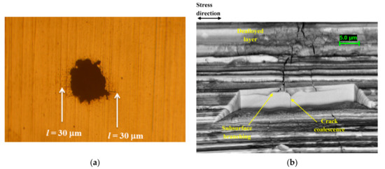 An interesting feature of the research of Guo et al. [16] was the observation of multiple small fatigue cracks emerging from the pit at different depths from the surface (Figure 5). As noted by Burns et al. [18], micro-topographical features offer a local stress/strain condition and so multiple cracks are not unexpected. However, most will become non-propagating, with those that survive and link up to form a fully developed crack around the pit being most influenced by the macro-stress/strain field and favourable microstructure.