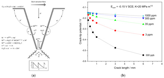 Modelling of crack-tip electrochemistry for FV566 12Cr MSS in chloride solution of low conductivity, reprinted with permission from [29] Copyright 2017 Crown Copyright: (a) schematic of processes involved; (b) dependence of crack-tip potential on crack length and chloride ion concentration; (c) crack-tip chloride ion concentration; (d) crack-tip pH.