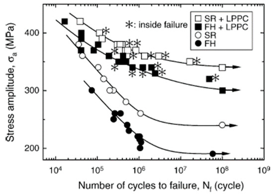 - Takahashi, K.; Kogishi, Y.; Shibuya, N.; Kumeno, F. Effects of laser peening on the fatigue strength and defect tolerance of aluminum alloy. Fatigue Fract. Eng. Mater. Struct. 2020, 43, 845–856. [Google Scholar] [CrossRef]