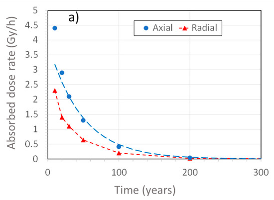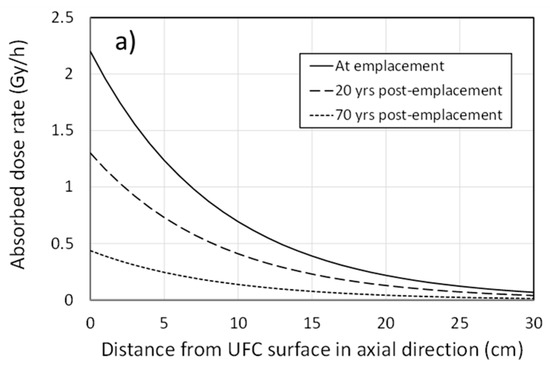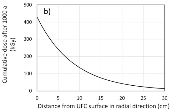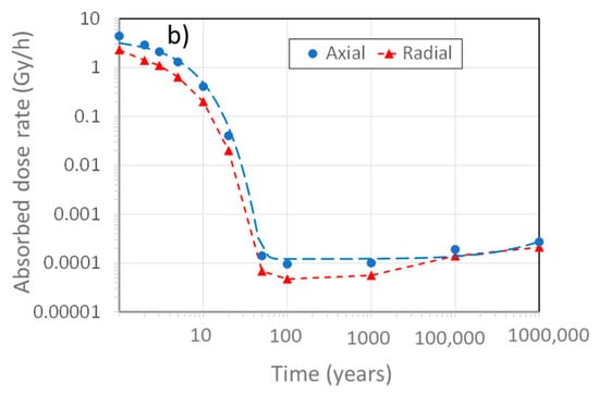 Figure 2 shows the time dependence of the γ-dose rate on the surface of the UFC at both the mid-point along the length (radial) and at the end of the hemispherical heads (axial) of the UFC, the latter location having the higher dose rate because of less shielding resulting from the reduced wall thickness. At the time of emplacement, the surface dose rate is of the order of 1 Gy/h, which compares with an average surface dose rate of 0.055 Gy/h for SKB’s KBS-3 canister [11]. The early decrease in dose rate is due to the decay of fission products and falls to insignificant levels after several hundred years. At longer times, the in-growth of γ-emitting actinides results in a low, but persistent, γ-dose rate, so that the dose continues to accumulate, even after 100,000 years (Figure 2b), although the dose rate changes only slightly.