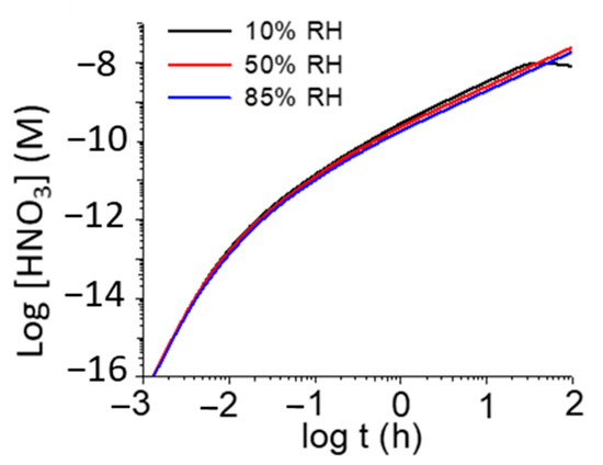 Time evolution of [HNO3]g produced by γ-radiolysis for different RHs at 75 °C and a dose rate of 1 Gy/h. Reprinted with permission from Morco et al. [19]. Copyright 2017.