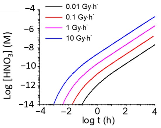 Time evolution of [HNO3]g produced by γ-radiolysis of 85% air at 75 °C at different dose rates. Reprinted with permission from Morco et al. [19]. Copyright 2017.