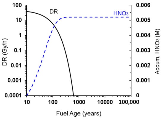 Evolution of [HNO3] and dose rate as a function of fuel age. Reprinted with permission from Morco et al. [9]. Copyright 2017.