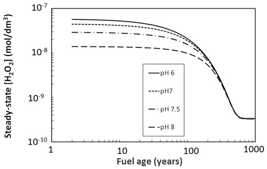 is assumed to be under kinetic control, since the peroxide concentration is maintained at the UFC surface by the radiolysis process. The decomposition of hydrogen peroxide to oxygen and water is presumed not to occur. Rate parameters for the reduction of H2O2 are taken from the study of Vazquez et al. [73]. The interfacial [H2O2] is assumed to be equal to the steady-state concentration estimated from the simplified aqueous phase radiolysis model for deaerated conditions described by Equation (2). The pH of the pore-water in the buffer box will be buffered at a pH of 7–8, due to the presence of calcite in the bentonite, with a value of pH 7 used for the current calculations in order to be conservative, as this pH presumes the highest amount of peroxide will be produced within this pH range (Figure 8).