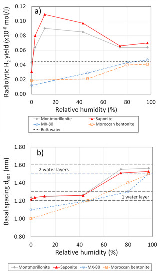 It is also interesting to relate the production of radiolytic H2 to the amount of H2O in the system. Figure 9b shows the basal d-spacing of the different montmorillonite powder samples determined by X-ray diffraction as a function of RH. Basal d-spacings of 1.2–1.3 nm and 1.5–1.6 nm are characteristic of one and two water layers, respectively [38]. For RH values of up to 50%, the clay surface is covered by a single monolayer of H2O, with a second water layer forming at RH values exceeding 70%. Thus, the enhanced radiolytic yield of H2 (compared with that in bulk solution) exhibited by synthetic clays at RH ≤ 70% (Figure 9a) is the result of direct energy transfer to a surface H2O layer rather than due to radiolysis of a bulk aqueous phase. Even in saturated clays, much of the radiolysis will involve adsorbed H2O with bulk radiolysis reactions only occurring in large pore-water-filled pores between clay aggregates. Bulk radiolysis models, therefore, may need to be adjusted in order to properly account for radiolytic yields in compacted clay systems.