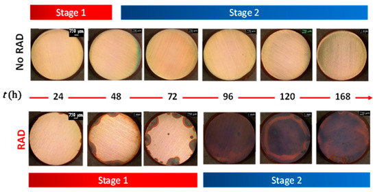 The impact of a radiation dose rate of 2 kGy/h on copper corrosion in contact with water droplets (50 µL) with different initial pHs and cover gases in sealed quartz vials has also been studied [46]. The corrosion kinetics were investigated by measuring the dissolved copper concentration, the change in pH, and the morphology, elemental composition, and cross-section of oxides on a coupon surface, as a function of exposure duration. Figure 10 shows the optical images showing the evolution of surface morphology for copper coupons exposed to water droplets under aerated conditions with and without γ-radiation. As can be seen, in the presence of high field γ-radiation, corrosion was accelerated, and the features of corrosion products progressively changed with time. The impact of radiation is more pronounced by decreasing the pH in the water droplet, which increases the dissolution of Cu ions. During the course of exposure, as the concentration of Cu ions increases, the precipitation of Cu2O particles on the surface (as indicated by X-ray photoelectron spectroscopy) was noticeable. Once the entire surface is covered with copper oxide, no significant change in dissolved copper concentration and pH was observed. The results show that γ-radiation decreases pH and increases the duration of Stage 1. The decrease in pH increases the concentration of CuII(sol) and increases the overall rate of Cu2O particle growth in Stage 2 (stages are shown in Figure 10).