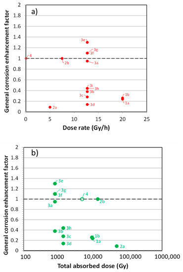 In addition to these recent Canadian studies, there have been a number of Swedish studies of the RIC of oxygen-free copper in deaerated high-purity water [47,48,49,50]. Experiments were conducted at relatively high absorbed dose rates (80–770 Gy/h), but to total absorbed doses similar to those predicted for a KBS-3 container for periods up to 100 years in a DGR (i.e., on the order of 100 kGy). The initial study produced a number of issues of potential concern, which were subsequently resolved, including: