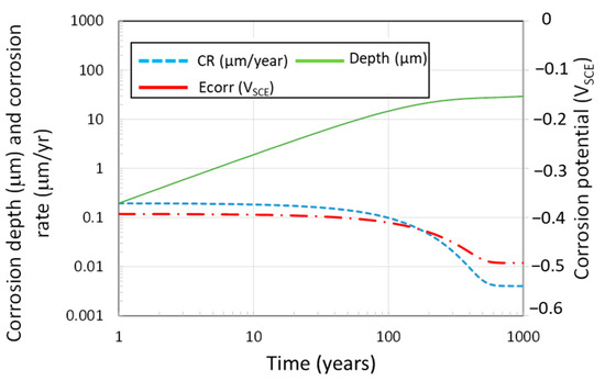 Predicted evolution of the corrosion potential, corrosion rate, and the depth of radiation-induced corrosion of the copper UFC based on mixed-potential modelling and a simplified radiolysis model for the production of H2O2. The prediction was made for the highest dose rate on the copper surface corresponding to the axial orientation and for an assumed buffer pore-water pH 7.