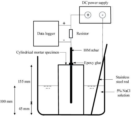 For each mortar mixture, three 100.0 mm × 200.0 mm cylindrical specimens with a 10 mm steel reinforcement bar, centrally embedded in each specimen, were prepared. The steel rebar was embedded in such a way that a 45.0 mm all-round cover of the reinforcement bar was achieved. The rebar embedded length and surface area in mortar specimens were 155.0 mm and 5503 mm2, respectively. Before embedding the steel reinforcement bars, reinforcements were cleaned thoroughly using an acetic acid solution, and the initial mass was determined. After 14 days of curing in the moist room, specimens were partially immersed to about half-height in a container of 5% NaCl solution, as shown in Figure 1. The partial immersion of specimens in the 5% NaCl test solution was to ensure oxygen availability in the specimens. To minimize the negative effect of specimen temperature rise on the electrochemical process, a low impressed voltage of 7.5 V was used in accelerating the corrosion test. The power supply instrument used was a READER Regulated (30V 3A) DC Power Supply. The embedded steel rebar, which was the working electrode, was connected to the positive pole of the DC power supply. For the counter electrode, a 2.4 mm-diameter, corrosion-resistant, Type 316 Grade stainless-steel rod which conforms to the ASTM A276 [25] specifications was used. Based on outcomes from trial tests, local corrosion at the location where the steel rebar protruded from the specimen top surface was prevented through the application of an epoxy glue coating around the steel rebar. With a constant applied voltage, the current flowing through the embedded rebar evolved as the resistivity of the overlaying mortar changed with time. All tests were performed at 23 ± 1.0 °C, and the rebar corrosion current data were acquired at one-second intervals using a personal computer as the data logger. The current density was calculated by normalizing the measured current with the surface area of the embedded section of the steel rebar. Faraday’s theoretical corrosion-induced mass loss was calculated using Equation (1):