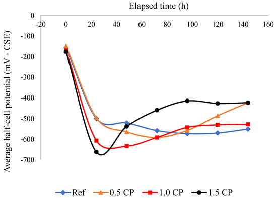 The initial HCP readings shown in Figure 2 indicate that embedded reinforcement bars were inert and differences in measured values were relatively small. However, after the first day of the test, HCP measurements became more electronegative with increasing CP content in the mortar. HCP values of −499.0 mV for Ref, −497.0 mV for 0.50 CP, −607.0 mV for 1.0 CP, and −662.0 mV for 1.5 CP were measured after 24 h of running the corrosion test. According to the ASTM C876 [28] specifications, there was more than a 90.0% probability that all the specimens were actively corroding. Specifically, these results suggest that relative to the Ref mortar, the risk of rebar corrosion was the highest in CP-blended mortar specimens. The increasing electronegative HCP values recorded for the CP-blended mortar mixtures in the first 24 h are ascribed to the higher degree of rebar oxidation in these mortar specimens.