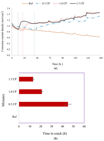 Average corrosion current densities of the steel rebar embedded in the plain Ref and CP-modified mortar mixtures are shown in Figure 3a. While Figure 3a indicates three corrosion current trends for CP-modified mortar mixtures, a single trend is highlighted for the plain Ref mortar. The gradual decrease in the corrosion current density observed in both Ref and CP-modified mixtures is traced to the electrolysis of water in the pores, and the evolution of the oxygen gas associated with the reaction [34,35]. Consequently, the increased oxygen concentration at the rebar surface led to surface oxidation and the formation of iron oxide layers. According to [34], the resistivity of an iron oxide layer is higher than that of an uncorroded steel rebar [34]. Hence, the sustained deposition of iron oxide on the steel rebar surface caused the corrosion current density to continue decreasing inevitably until the oxide layer was thick enough to induce micro-cracking of the rebar mortar cover.