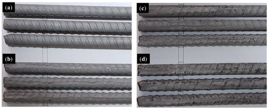 Figure 4 shows pictorial images of steel reinforcement bars extracted from mortar specimens at the end of the accelerated corrosion test. Increasing levels of localized and non-uniform loss of the rebar section as the CP content of mixtures became higher are evident in Figure 4b–d. Non-uniform corrosion of reinforcement bars exposed to accelerated corrosion processes is not new, it has been reported in previous studies [45,46]. Research findings by Chen et al. [46] indicated that the non-uniformity of rebar corrosion became pronounced with time. They attributed this to the variation in the oxygen concentration around the rebar. Note that Sides 1 and 2 of the steel rebar in this discussion refer to the two opposite semi-perimeters of the rebar. The increased loss of section on Side 1 of the embedded reinforcement bars highlighted in Figure 4b–d is due to the proximity of the cracked reinforcement bar cover. Hence, the Side 1 rebar semi-perimeter adjacent to the crack was subjected to a higher degree of corrosion activity on account of the huge influx of rebar corrosion accelerants (oxygen, moisture, and chlorides) over time.