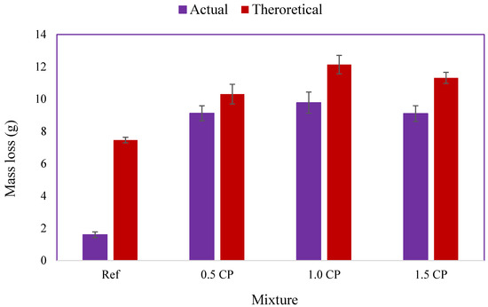 The discrepancy between the theoretical and the experimental mass loss highlighted in Figure 5 is not unusual; it has been reported in previous accelerated corrosion studies [45,46]. According to Austin et al. [45], the overestimation of Faraday’s rebar mass loss model is largely caused by two oversights. The first is the use of the total test duration instead of the elapsed time between rebar de-passivation and test termination in the mass loss calculation. The second is that the actual/effective corrosion energy is the energy utilized in the corroding section of a rebar rather than the energy supplied to the entire embedded rebar. This postulation was re-affirmed in a recent report by Hong et al. [34], which reported that the huge amount of energy consumed in the water splitting reaction during the pre-crack corrosion stage created a lot of inefficiency in the accelerated corrosion test. This inefficiency is the reason for the huge difference in actual and theoretical mass losses observed for the rebar embedded in the un-cracked Ref mortar. Although the increased mass loss of reinforcements embedded in CP-modified mixtures was anticipated given the higher current values measured and the early cracking of all the CP-blended specimens, the deviation in the mass loss trend observed for the 1.5 CP reinforcement was unexpected. It is also surprising that, contrary to the recent findings of the authors in a related study [47], the reduced sorptivity of CP-modified mixtures did not translate to enhanced protection of steel rebars against chloride corrosion. Apparently, the presence of CP-borne chlorides in the pore solution prior to the immersion of specimens in the 5% NaCl test solution was more debilitating compared to the influence of externally transported chlorides.