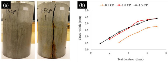 Thus, for smaller-sized crack formed at the very early stage of the corrosion test, the availability of a large volume of corrosion byproducts would partly fill the crack over time, creating an insulating barrier. With the occurrence of this, the corrosion process would not only reduce, but also expansive pressure and crack widening would slightly decrease. Although the erosion and detachment of the consolidated byproduct layer on the rebar surface and the unclogging of cracks with time could rejuvenate the corrosion and crack widening process, there is no evidence suggesting that this occurred in the CP-modified specimens. On the contrary, the reduced rebar mass loss and crack width of the 1.5 CP specimen in comparison to those of the 1.0 CP specimen highlighted in Figure 5 and Figure 6b suggest that the corrosion byproduct layer on the rebar embedded in the 1.5 CP specimen and the clogged crack might have remained intact. Thus, acting as an insulating layer, mitigating further rebar corrosion and cover crack widening.