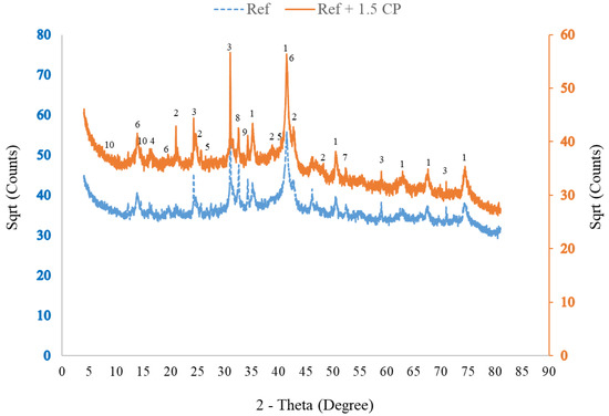 The specific volumes of oxide and oxyhydroxide phases found in steel corrosion byproducts are approximately 1.7–6.3 times greater than those of an uncorroded steel bar [48]. This implies that variations in the phase composition and porosity of corrosion byproducts could impact the generation of expansive pressure and crack propagation in the rebar cover. Figure 7 shows the XRD patterns of rust residue obtained from the steel bar embedded in the Ref and 1.5 CP-modified mortar mixtures. Amorphous material highlighted as large humps in the middle of the XRD patterns and traces of rock phases such as quartz, albite, and clinochlore that are probably artifacts from the fine aggregate are evident in the diffractograms shown in Figure 7. However, the main expansive corrosion byproduct phases shown in Figure 7 are iron (III) oxyhydroxides; akaganeite (β-FeOOH), goethite (α-FeOOH), and lepidocrocite (γ-FeOOH) and iron oxides; magnetite (Fe3O4) and hematite (α-Fe2O3). A semi-quantitative phase analysis by Rietveld refinement was also performed, and the results for the iron phases, which constitute about 66–68 wt% of all the phases identified, are presented in Table 4.