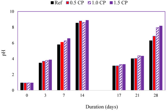 Changes in the pH of the HCl test solution over time are shown in Figure 8. After the first 7 days of specimen immersion, the pH increased from approximately 0.9 to 5.8 for Ref, 6.1 for 0.5 CP, 6.3 for 1.0 CP, and 6.6 for 1.5 CP. Although a general increase in the pH of all the test solutions was expected, the slightly higher values of the test solutions containing CP-modified mortar specimens were surprising. The general increase in the alkalinity of the HCl test solution is traced to the continuous dissolution and leaching of portlandite, calcium, and other hydrates from the specimens [51,52]. These leachates gradually transformed the pH of acid test solutions from highly acidic to different milder degrees of acidity and alkalinity over time. Similar increases in the pH of the HCl acid solution containing cement paste and mortar specimens over time have also been reported in the past [53,54]. Although the pH of test solutions continued to increase between 7 and 14 days of specimen immersion, there was no distinct pH trend. This is most likely a result of the reduced corrosiveness of the acid solution and non-uniform depletion of hydrates from the already decalcified surface of the specimens. Despite the change in test solutions at the end of the first 14 days, the test solution pH trend at 21 days remained ill-defined. However, by the 28th day, the acid attack had progressed into the intact, inner area of the specimens. Hence, with the increased dissolution of cement hydrates, and a concomitant rise in pH, a distinct pH trend was observed. The measured pH values at 28 days were 6.3 for Ref, 6.9 for 0.5 CP, 8.0 for 1.0 CP, and 8.2 for 1.5 CP.