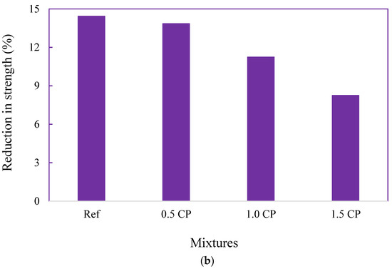 Variations in the compressive strengths of specimens exposed to moist curing and the HCl test solution for 28 days are highlighted in Figure 9a. While the average 28-day moist-cured compressive strengths of mortar mixtures were 71.0 MPa for the Ref and 66.5 MPa for the CP-modified mixtures, the residual strength of all specimens after acid exposure ranged from 57.4 to 60.9 MPa. Relative to the moist-cured specimens, Figure 9b shows that the reduction in the compressive strength of the acid-attacked specimen was 14.4% for the Ref mortar, 13.9% for the 0.5 CP mortar, 11.2% for the 1.0 CP mortar, and 8.2% for the 1.5 CP mortar. Some of the inferences drawn from these results are as follows: First, acid attack-induced strength loss was generally small for all the mixtures. This is partly traced to the limited surface area-to-volume ratio of the 50 mm3 test cubes. Hence, relative to the standard prisms typically used for mortar durability studies, the specimen surface area subjected to acid attack was lower. Moreover, the continued hydration of specimens and the associated microstructure development, while immersed in the acid solution, may have also contributed to the reduced deterioration. Nonetheless, the data in Figure 9a,b suggest that the addition of 1.0–1.5% CP to mortar could potentially enhance its acid attack resistance.