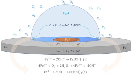 The iron oxidation reaction at the drop’s center supplies the electrons for the oxygen reduction reaction at the periphery for the formation of OH− ions (Figure 8). Oxidation and reduction kinetics on the iron surface are commonly described by Tafel expressions, however, we have also taken into account that the corrosion rate for this system is also limited by O2 mass transfer [9,13].