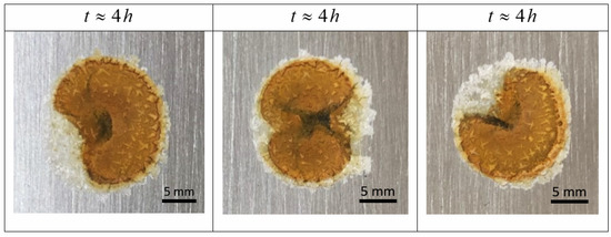 A time sequence of images illustrating the evolution of the Evans’s drop experiment on the surface of a freshly polished iron plate is shown in Figure 2. Once the droplet of saline solution with the indicators added is dropped on the iron surface, it immediately starts developing a blue color at the central anodic part due to the oxidation of Fe to produce ferrous ions, Fe2+, which react with ferricyanide ions in solution, Fe(CN)63−, to form an insoluble precipitate of Prussian blue, Fe4[Fe(CN6)]3. Released electrons during the Fe oxidation move to the periphery of the drop, where O2 is reduced at the cathodic areas producing hydroxyl ions, OH−, while the Fe surface remains bright [3]. In the process, the pH of the periphery increases, and the phenolphthalein changes the color of the solution from colorless to magenta as it is evidenced in the images. On the other hand, ferrous ions that do not react with ferricyanide at the center diffuse and migrate in solution, reacting with hydroxyl ions coming from the drop´s periphery to produce either ferrous hydroxide or react with incoming O2 to produce ferric ions. The former ones react with hydroxyl ions in solution to produce ferric hydroxide [9]. The complete set of reactions taken into consideration in the system for the calculations were summarized previously in Equations (1)–(5).