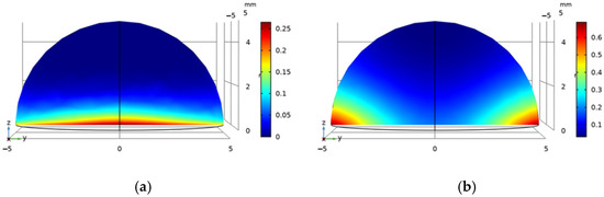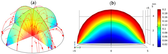 A simulation of the current and potential distribution for the whole system is shown in Figure 5a, where the arrows emerging from the central zone (anodic region) move toward the periphery (cathodic region). A similar result has been reported for an analogous experiment modeled with Butler–Volmer’s equation on a Zn surface reported by Venkatraman [11]. They also predicted the movement of charged ions in a solution promoted by diffusion and migration caused by the electric field. In both systems, the results approximate the ones calculated for a primary current distribution, without taking into consideration kinetics and mass transfer [12,13]. Accordingly, the equipotential lines are parallel to the electrode surface and perpendicular to the current lines. On the other hand, Figure 5b shows the oxygen concentration profile that develops through the electrolyte. The O2 concentration value at the solution/air interface is the highest, approaching 0.2 mol m−3, which indeed is the boundary condition value used in the simulation, while at the center of the drop, the calculated O2 concentration approaches 0.02 mol m−3.