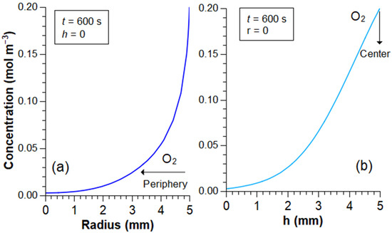 Concentration profiles for oxygen diffusion through the Evan’s drop. (a) From the center on the horizontal axis to the drop’s periphery. (b) From the center of the drop to the solution/air interface.