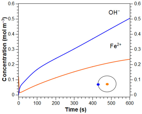 Variation of the ferrous ion concentration with time at a point in the center of the drop’s base (orange line); and the variation of OH− ion concentration with time located in the drop’s periphery represented by the upper, blue line.