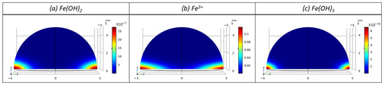 Concentration profiles of species involved in the Evans’s drop reactions, namely (a) ferrous hydroxide, Fe(OH)2, (b) ferric ions, Fe3+ and (c) ferric hydroxide, Fe(OH)3.