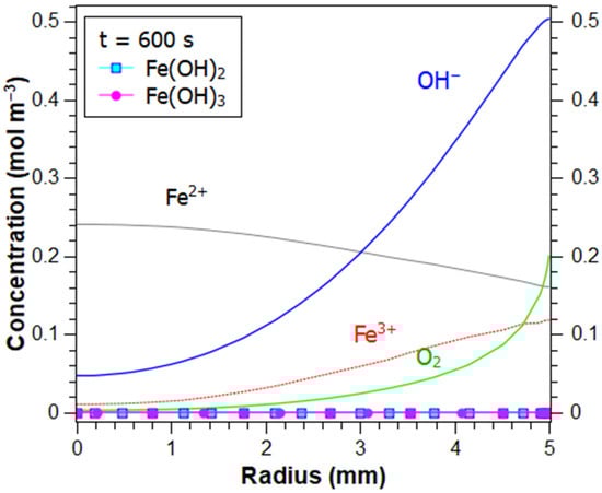 Figure 10 shows the concentration profiles of all the species considered in the Evans’s drop calculations, namely Fe2+, Fe3+, OH−, O2, Fe(OH)2, and Fe(OH)3 through the base radius at the electrode surface for a time of 600 s. Once the experiment is completed, it can be observed that the concentration of hydroxyl ion OH− is ca. 0.06 mol m−3 which is equivalent to a pH of 9.77 at the center of the drop. This pH value tends to increase towards the periphery, reaching a value of 0.5 mol m−3, equivalent to a pH of 10.69. The increment in the pH values is associated with a constant flux of oxygen coming from the surrounding air as well as the fact that the oxidation is maintained. The concentration of O2 was considered constant at the solution/air interface (0.2 mol m−3).