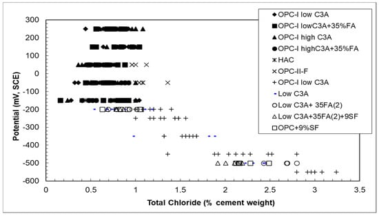 Values of chloride thresholds (by weight of cement) [,] for different types of binders and the potentials applied. The values at each potential indicate the individual values of 10 twin specimens tested for the same potential and binder type.